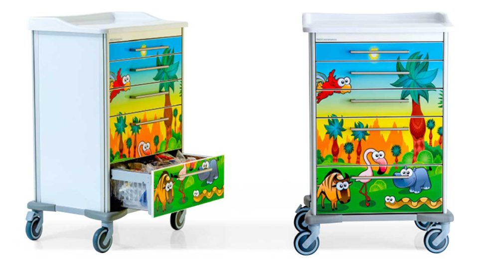 Receiving treatment in hospital can be a stressful experience, especially for children. Medstor has developed a special mobile module cart for children's wards that uses bright colours and cheerful cartoon-style jungle images to help distract the young patients from the treatment they are receiving, making a potentially difficult time a little easier. The carts also provide continuity: whenever the nurse comes over to check on the patient, the jungle animals will be there, too, helping to make the experience a little less upsetting by providing something bright and fun to look at.